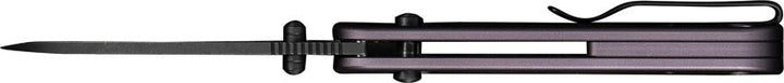 3.88" (9.86cm) closed. 2.88" (7.32cm) black stonewash finish CPM S35VN stainless drop point blade. Purple aluminum handle. Thumb stud. Lanyard hole. Pocket clip. Black nylon zippered storage case. Boxed.