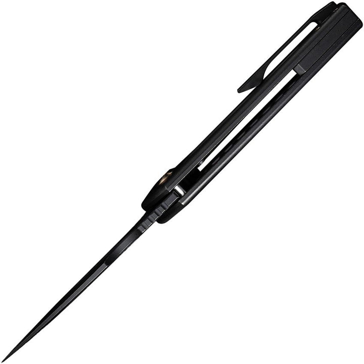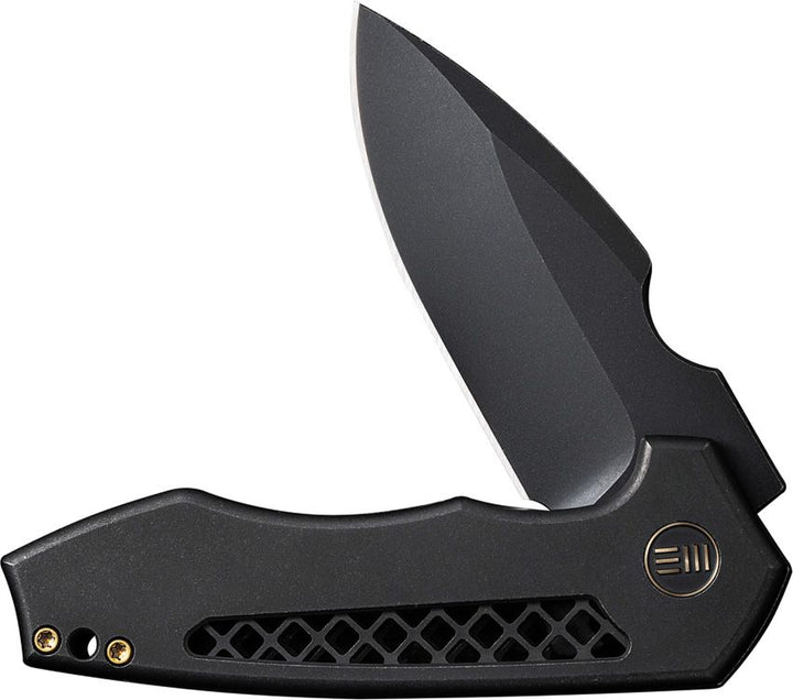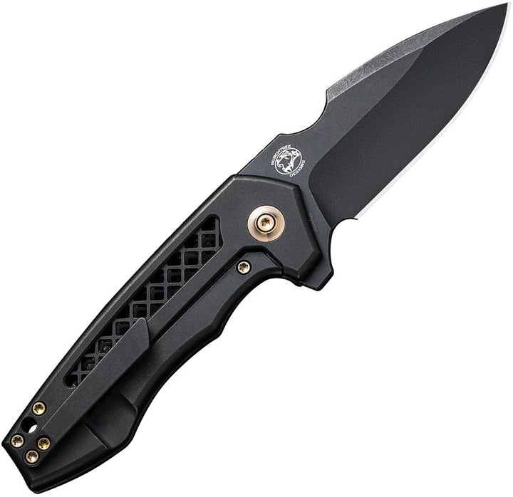 4" (10.16cm) closed. 3" (7.62cm) black stonewash finish CPM-20CV stainless modified drop point blade. Black stonewash finish titanium handle. Extended tang. Lanyard hole. Pocket clip. Black nylon zippered storage case. Boxed.