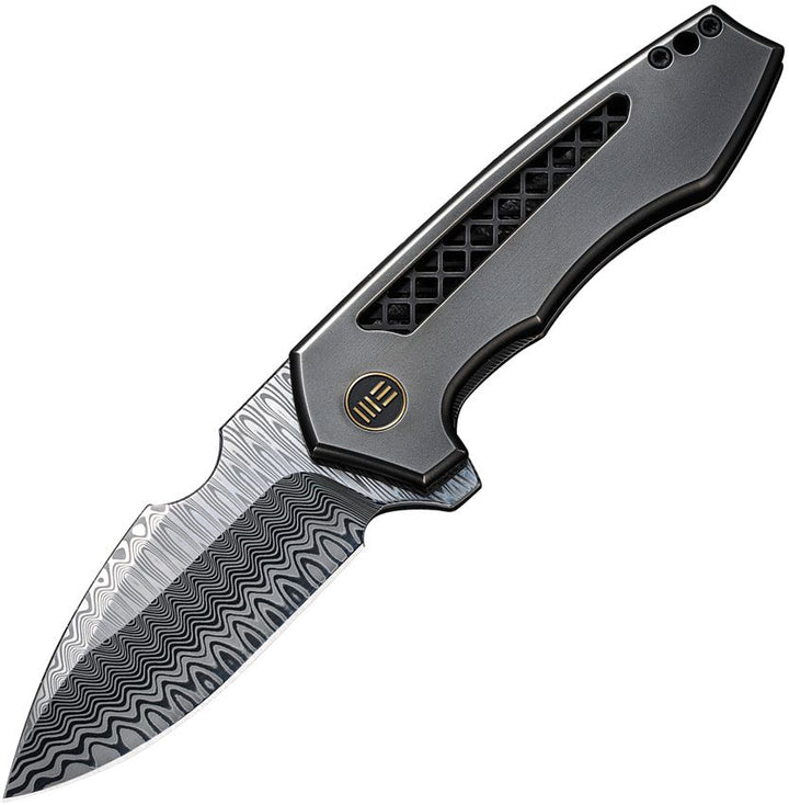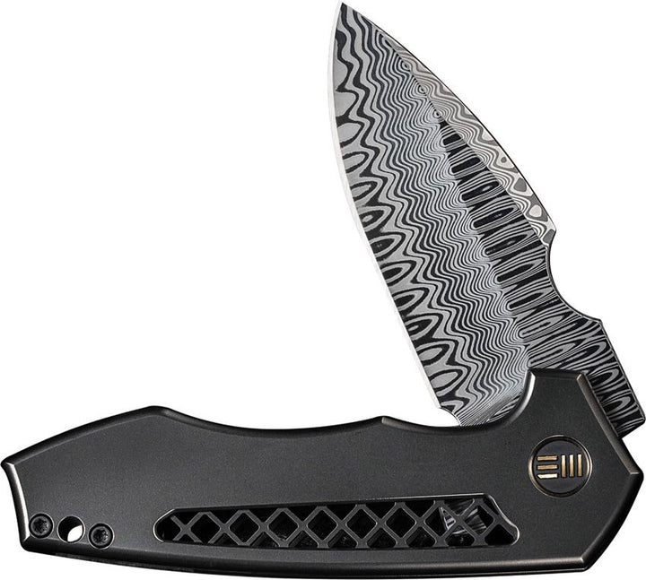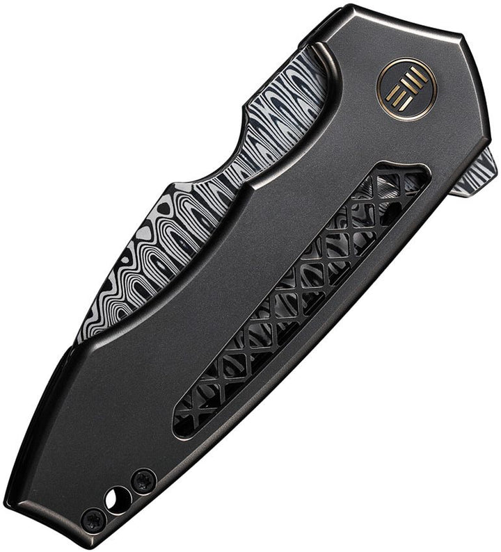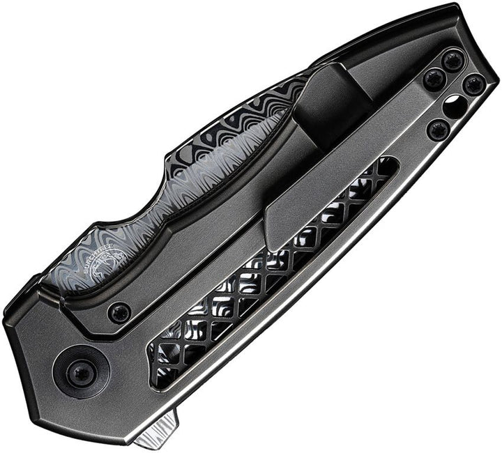 4" (10.16cm) closed. 3" (7.62cm) Damasteel modified drop point blade. Gray titanium handle. Extended tang. Lanyard hole. Pocket clip. Hugin blade. Black nylon zippered storage case. Boxed.