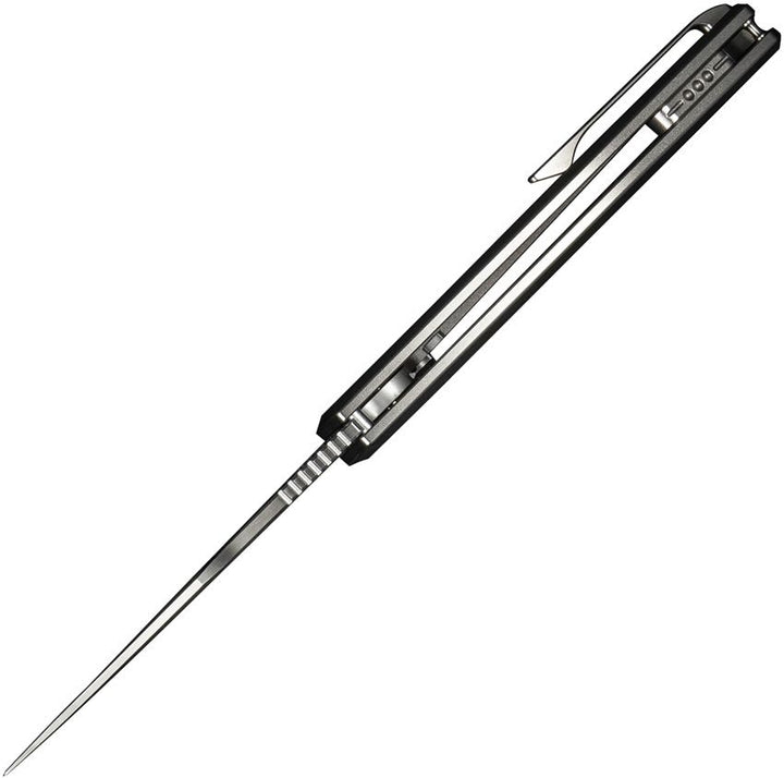 4.75" (12.07cm) closed. 3.5" (8.89cm) satin finish CPM-20CV stainless clip point blade. Bead blast finish titanium handle with Flame anodized titanium inlay. Pocket clip. Thumb pull. Limited edition of 260 pieces. Black nylon zippered storage case. Boxed.