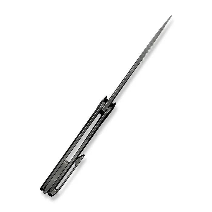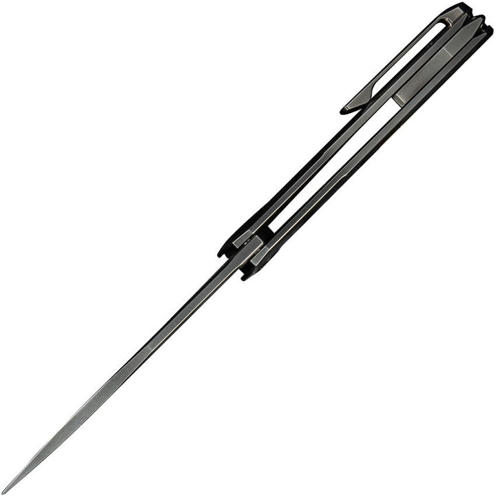 4.88" (12.4cm) closed. 3.88" (9.86cm) gray finish Bohler M390 stainless blade. Gray and satin titanium handle. Extended tang. Pocket clip. Black nylon zippered storage case. Boxed.