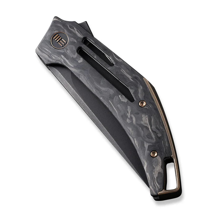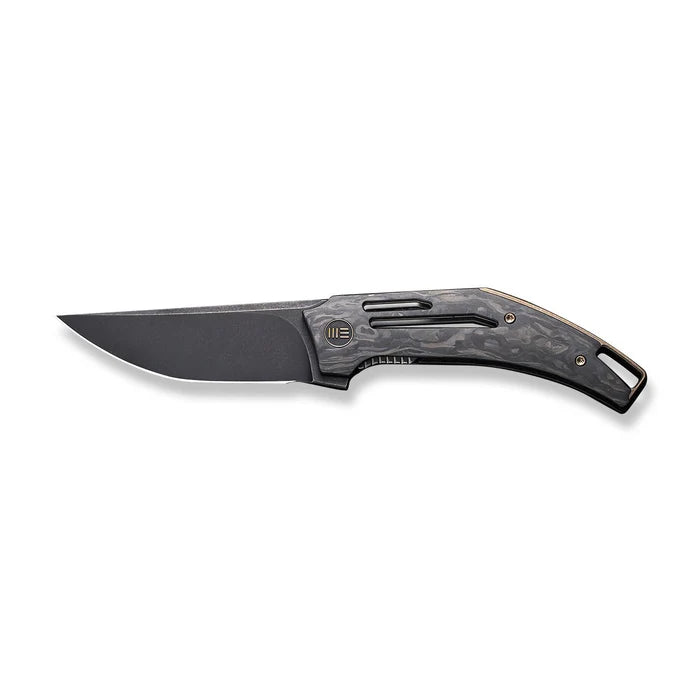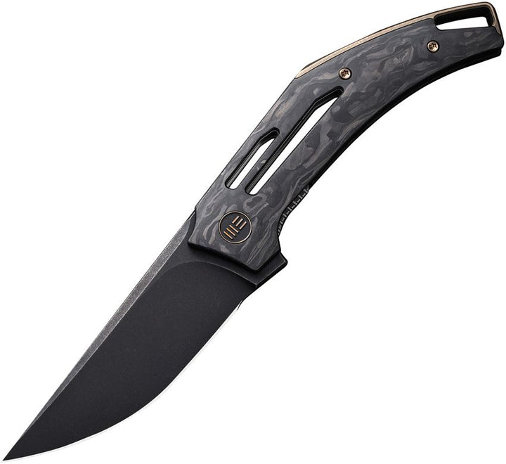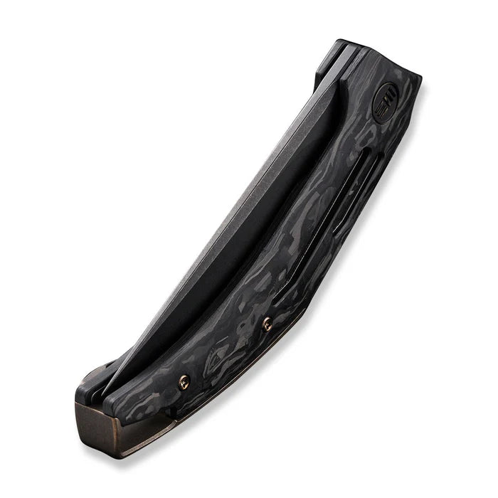 4.63" (11.76cm) closed. 3.38" (8.59cm) black stonewash finish CPM-20CV stainless blade. Shredded carbon fiber handle. Extended tang. Lanyard hole. Pocket clip. Black nylon zippered storage case. Boxed.