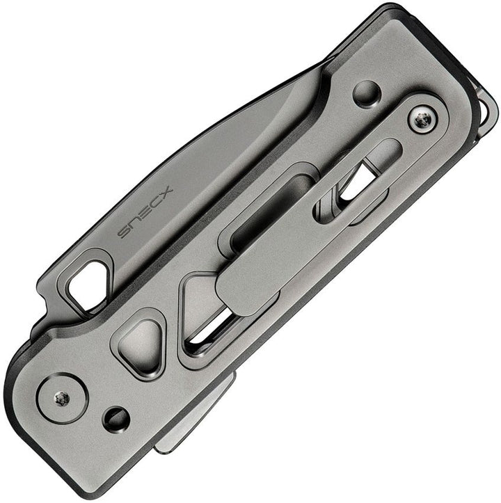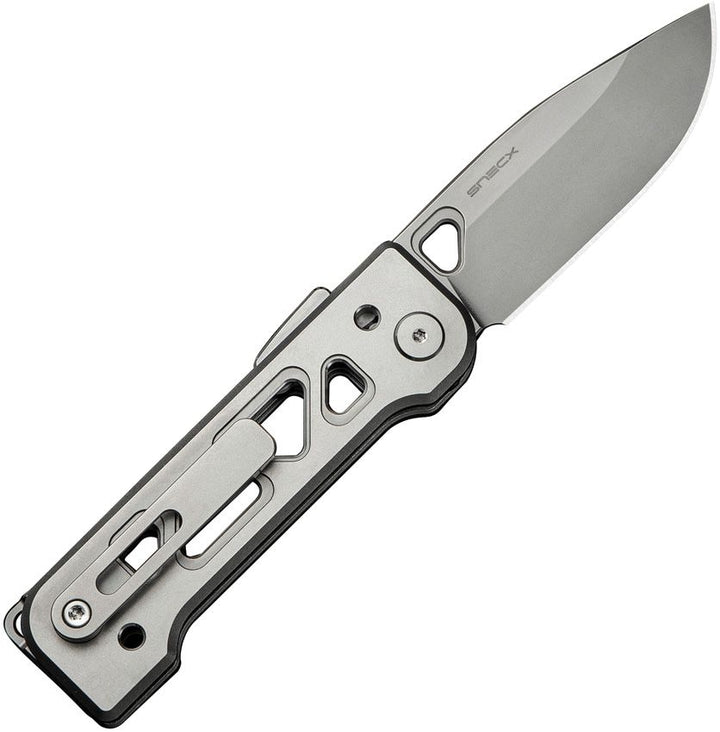 3.88" (9.86cm) closed. 2.88" (7.32cm) stonewash finish CPM-20CV stainless drop point blade. Gray titanium handle. Thumb pull. Lanyard hole. Pocket clip. Black nylon zippered storage case. Boxed.